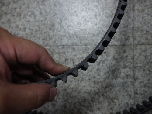 イヤー8月は今までで一番多くのお客様の車検をやらせていただきました。暑かったし、お客様の楽しいツーリングに行った話やら、これから行く話やら色々聞かされて羨ましい話ばかりでした、でも記録更新!仕事仕事・商売繁盛(笑)!!・・・久しぶりに今回ブログUPですが実はこんなの見たことが無い~!という話です。私達は特に安全に直結する車検をやらさせて頂いていますから、当然手は抜けません。今回、来週フェリーに乗って北海道を1ヶ月走り回るという、とてもうらやましいお客様から車検の入庫です。距離は8万kmですから、お客様希望でプレミアムコースの選択でいざ車検整備スタート、まあ8万kmですしプレミアムコースですから相当入念に見ていきます。もちろんベーシックコースでもいいのですがこのくらいの距離だと2万円の違いは大事です。今回話しはベルトです。これは見るからにすごいです。こんなのは初めて見ました。ベルトのコマが12-3箇所も写真のようにヒビワレ/ブラブラ状態!よくこれで乗れましたネ?もちろんベーシックでもきちんと見ます。わかります。専門店の我々プロ!ですから、でも今回お盆前でしたから焦ってお客様に連絡&純正部品の手配でぎりぎりフェリー出発に間に合いました。良かった~ふう~・・・・。メーカーの部品出荷もお盆は止まります。間に合ってよかったです。今頃どこ走っていますかね?